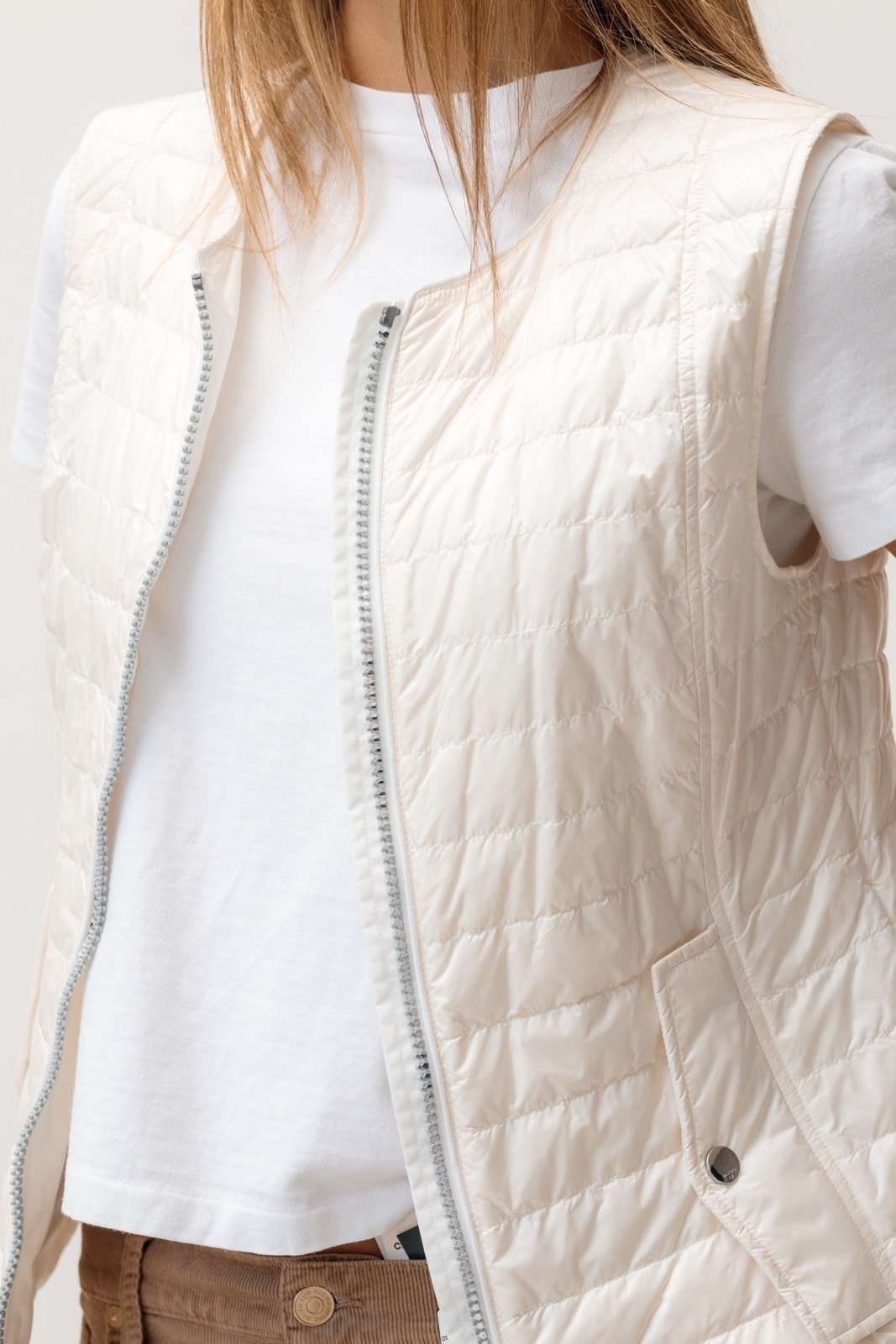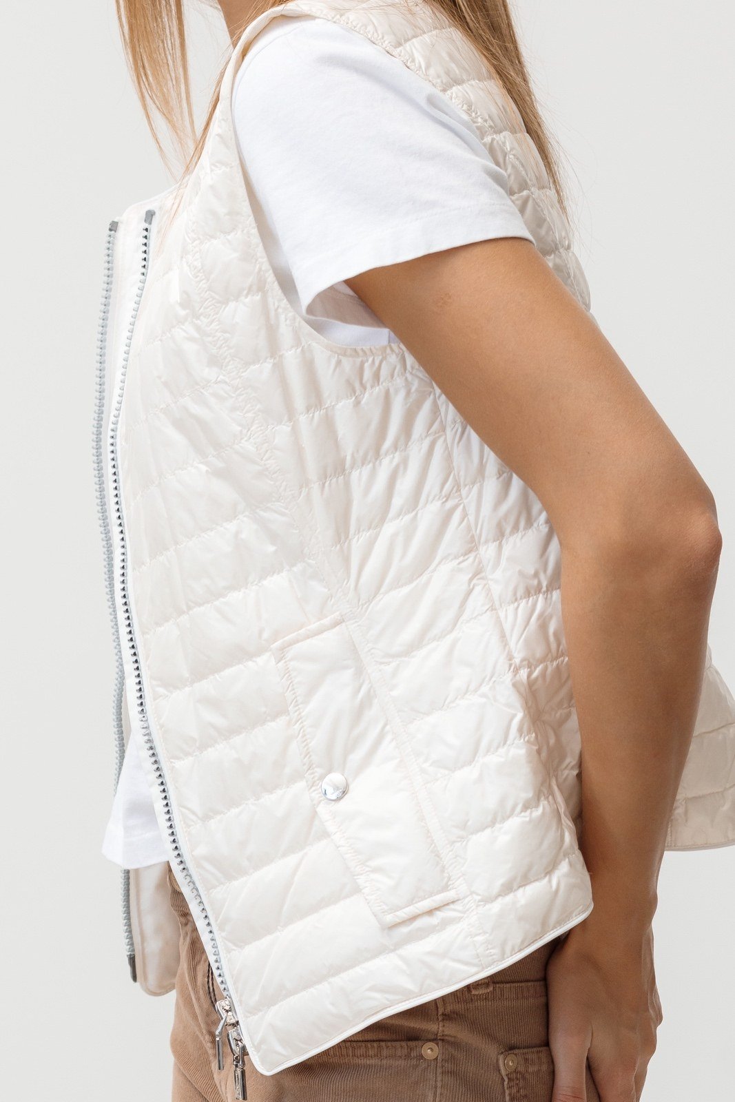 Опис: Для пошиття чорного приталеного жилета майстри марки використовували легкий міцний нейлон із глянцевим блиском. Матеріал із особливо щільним переплетенням волокон не пропускає вітер. Добірний качиний пух з додаванням пера, рівномірно розподілені по стьобаних камерах, підтримують комфортну температуру. Модель доповнили кишенями із великими клапанами.