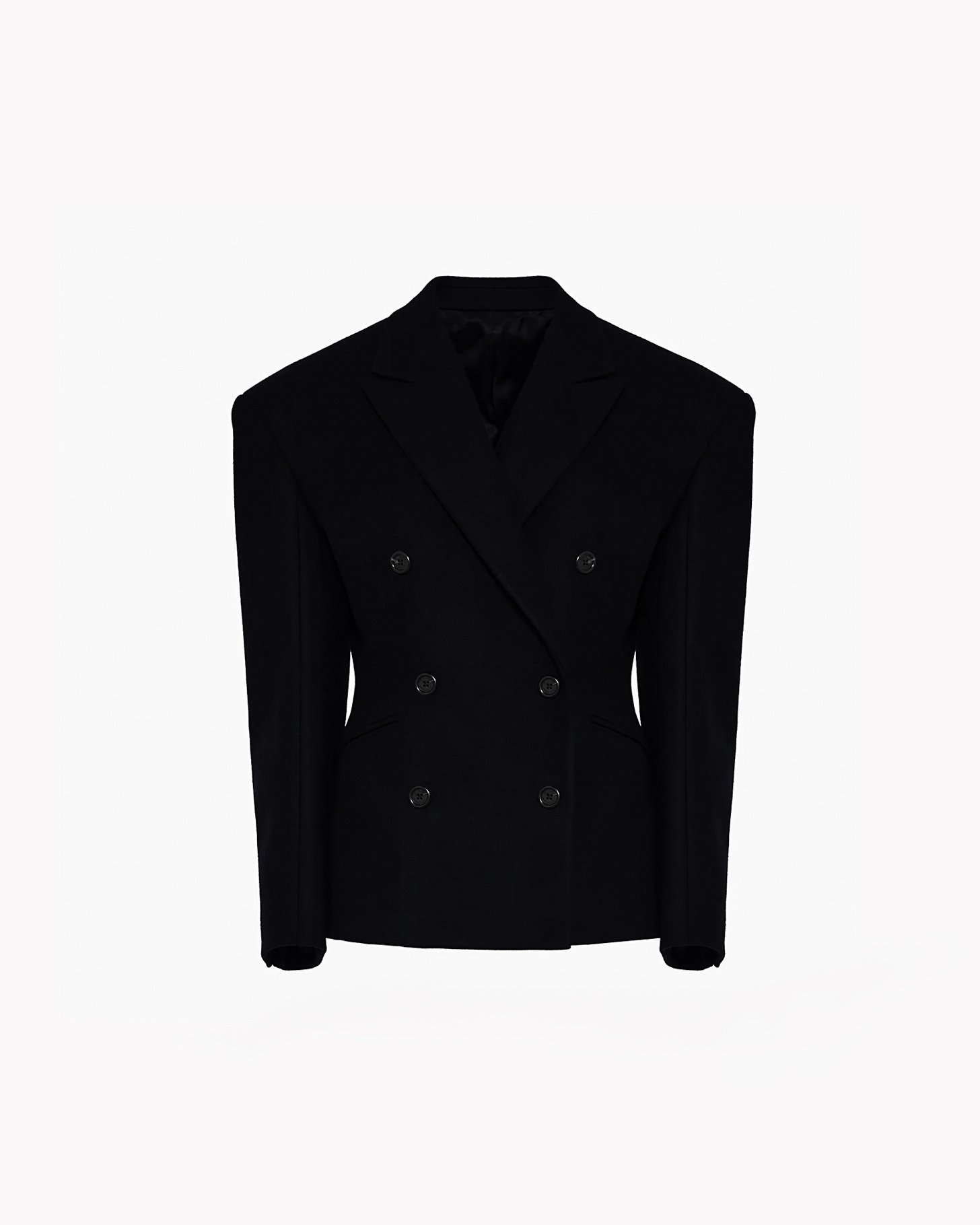 Оверсайз двобортний піджак стрінгу з вовни та кашеміру з фіксованою талією, класичними чоловічими деталями пошиття, нагрудною кишенею, боковими прорізними кишенями та внутрішніми кишенями. Рогові ґудзики.