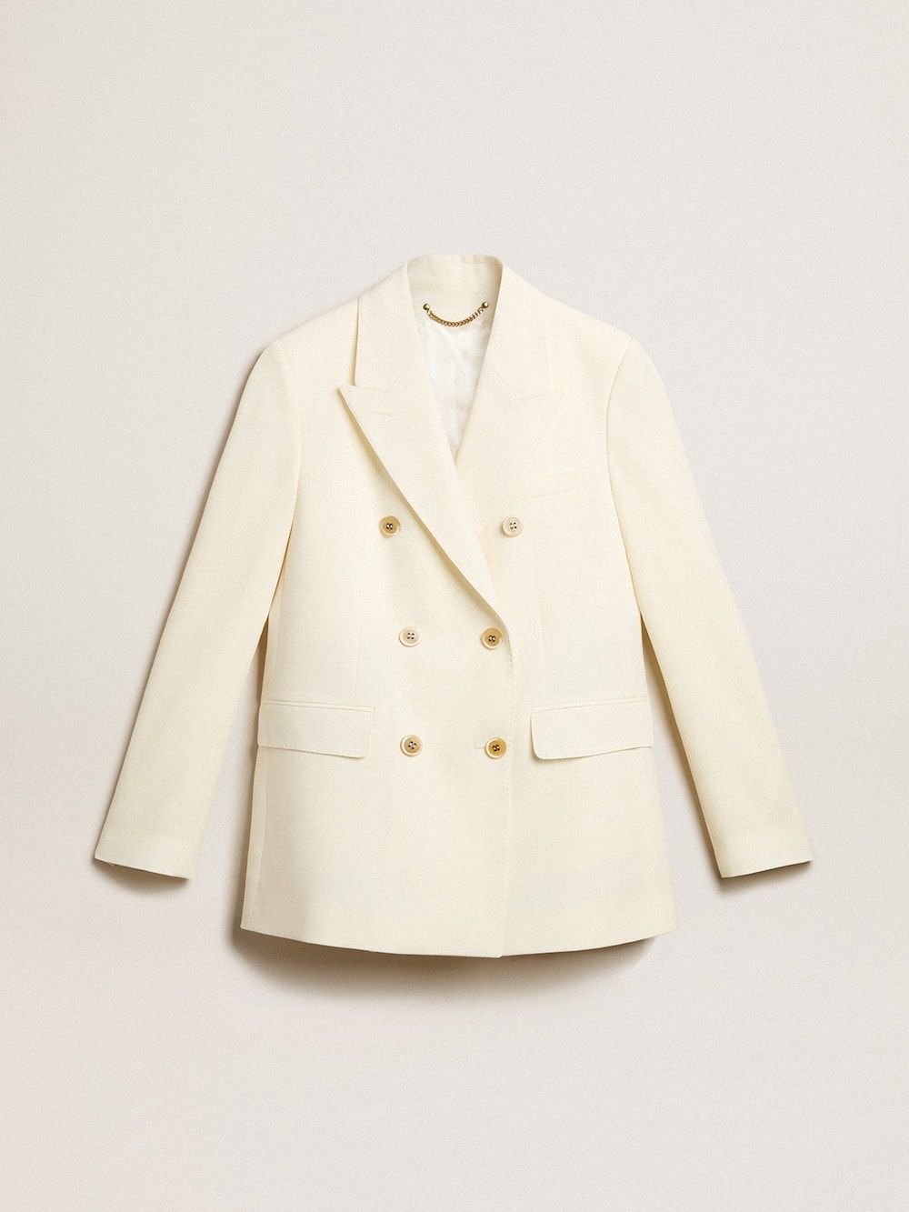 Цей двобортний блейзер звичайного крою зістареного білого кольору застібається на перламутровий ґудзик.
