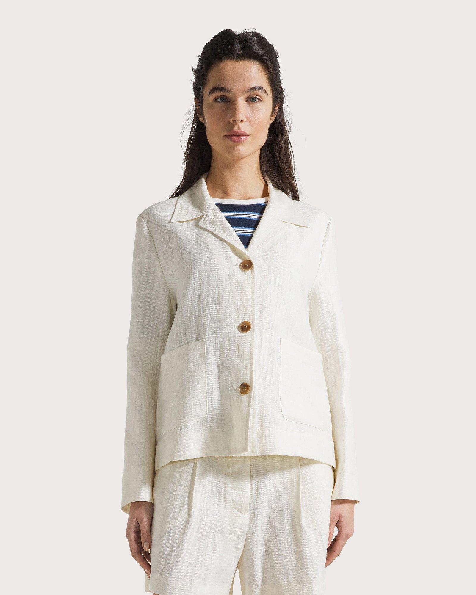 Коротка куртка з м'ятої змішаної лляної тканини із застібкою на три ґудзики та накладними кишенями.
