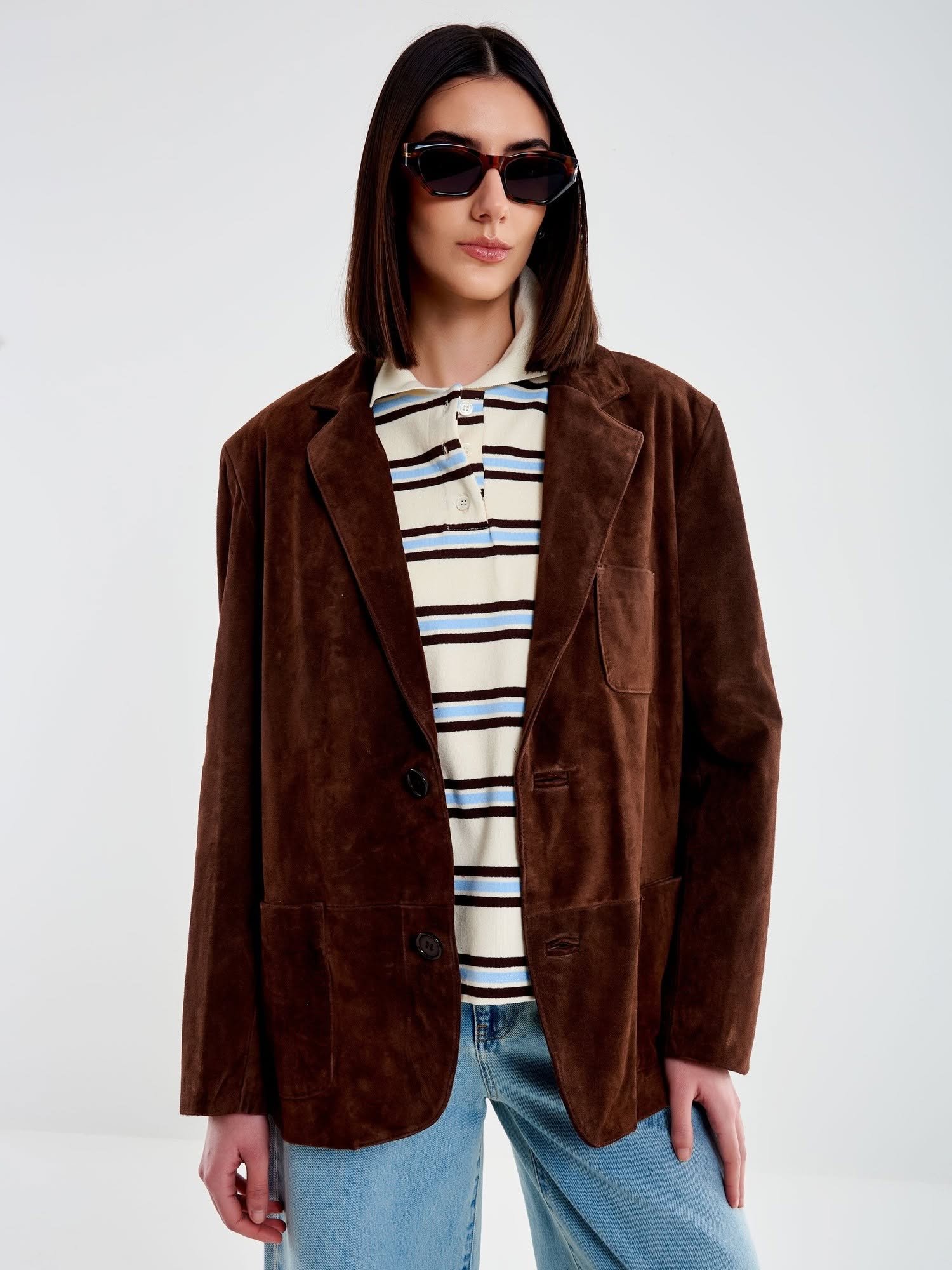 Однобортний піджак великого розміру з довгими рукавами та коміром-відворотом. Передні накладні кишені.